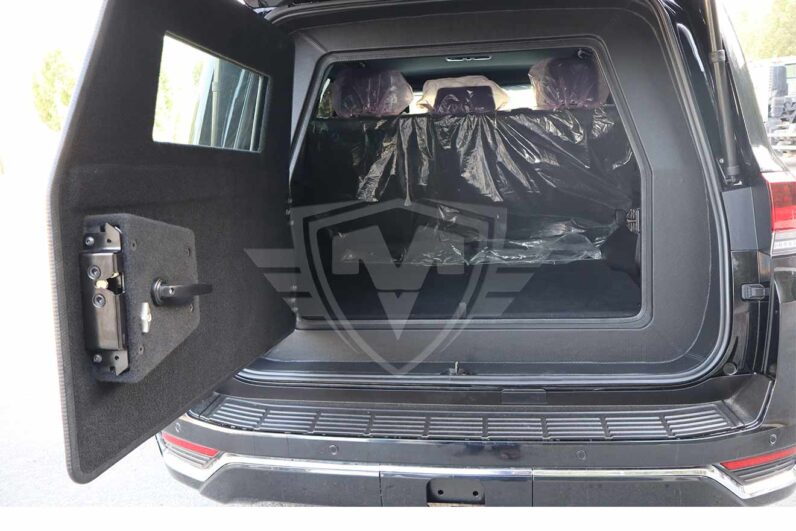• Armored to international standards, with reinforced body panels, bullet-resistant glass, and run-flat tires.